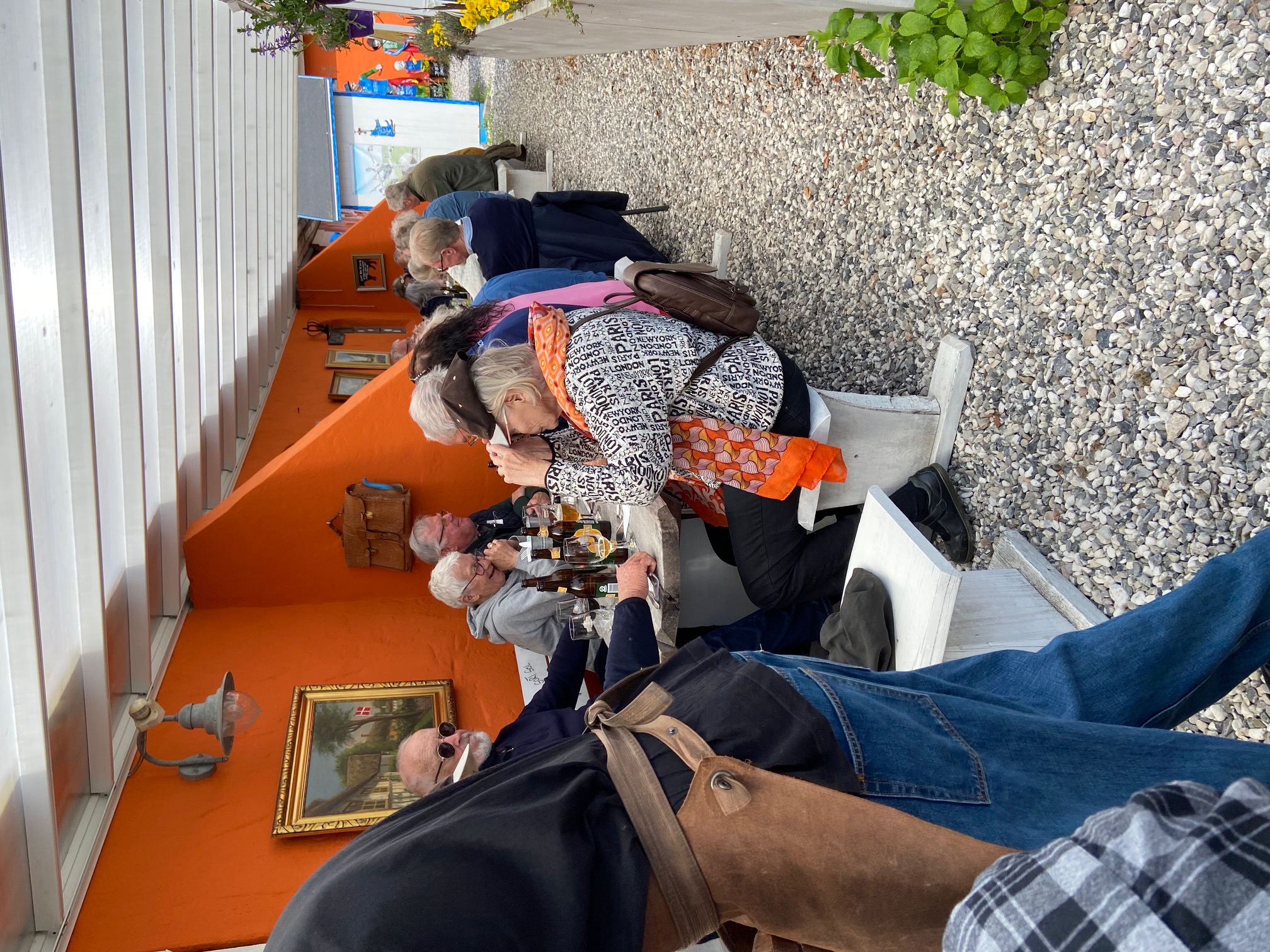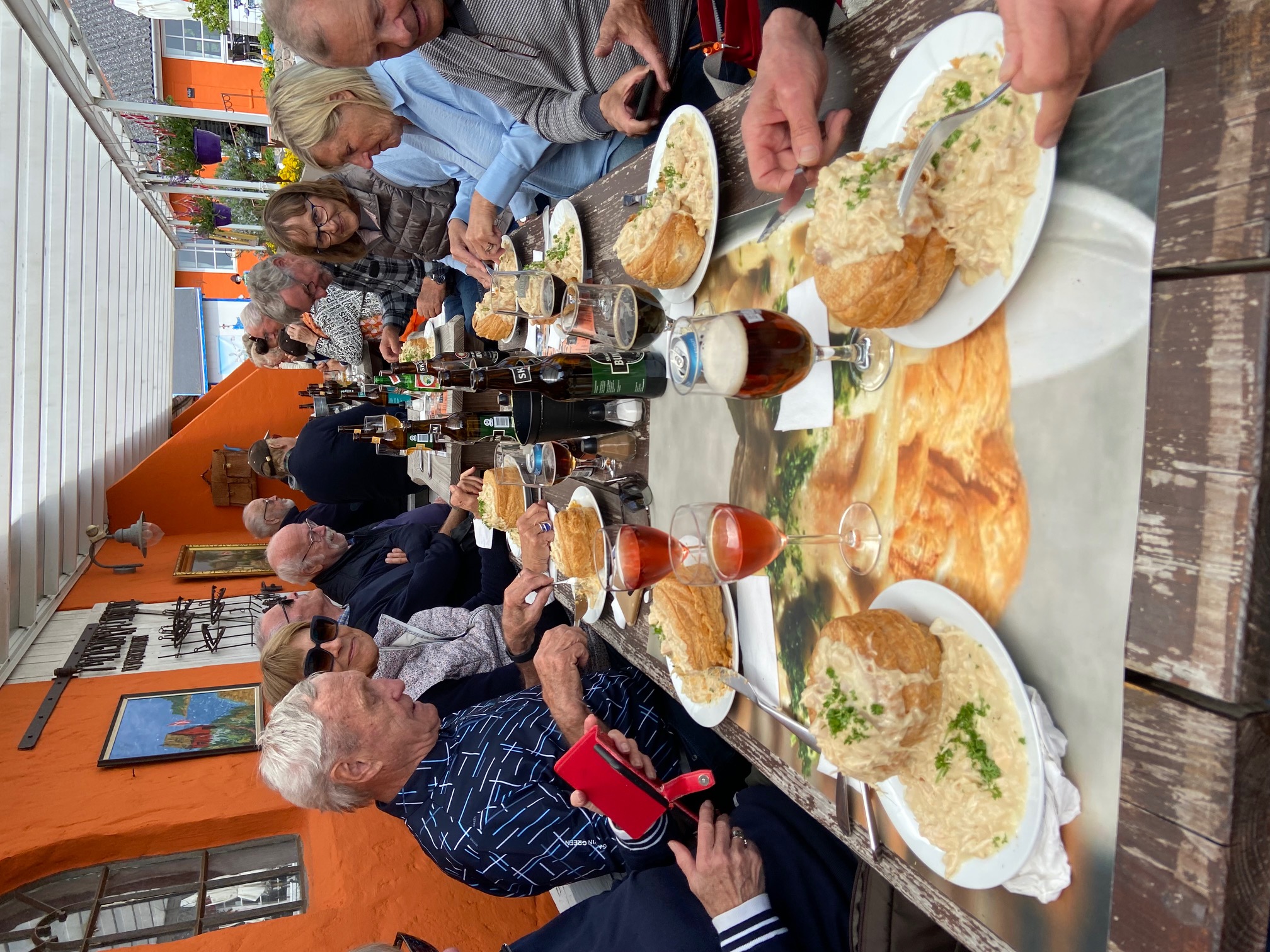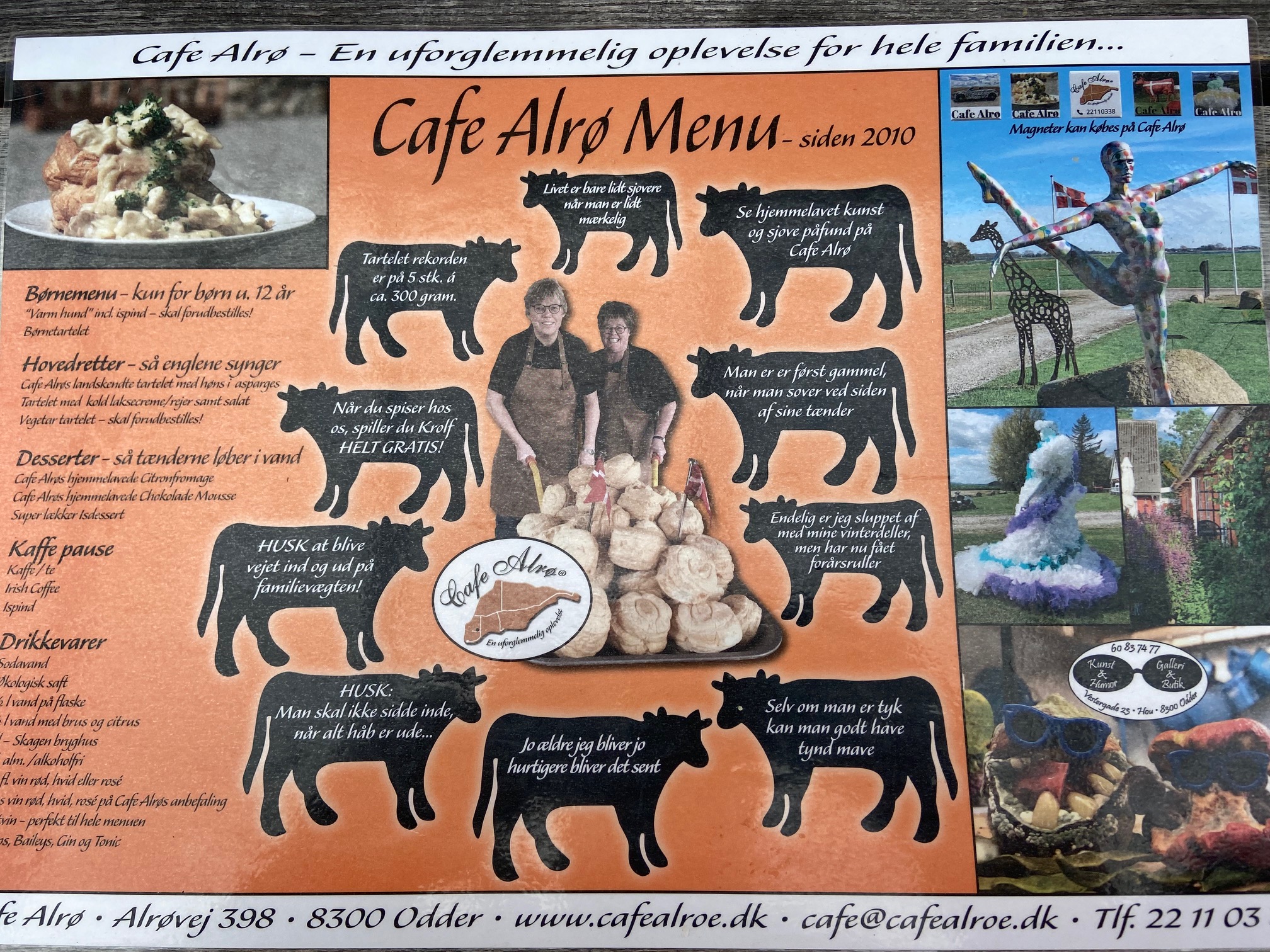 Efter prøverne og tissepause kørte vi mod cafe Alrø, hvor kæmpetarteletter ventede på os. Igen en smuk køretur med masser af solskin, og så er Danmark ikke kønnere. Cafe Alrø er et farverigt sted med masser af sjove figurer og udstillinger, det kan man godt bruge lidt tid på at studere. Rekorden for antal spiste tarteletter, en person har spist, er 5 stk. en tartelet vejer 400 g, så må denne person også været blevet mæt.