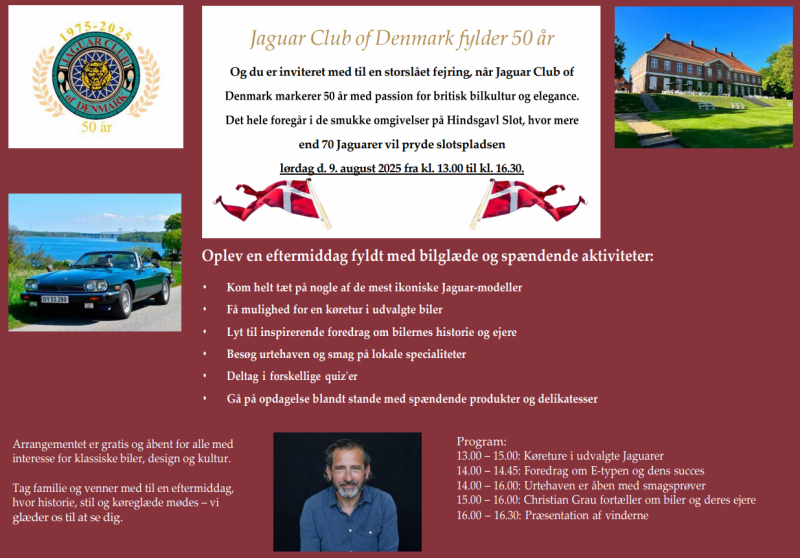 Lørdag d. 9. august fejrer Jaguar klubben deres 50 års jubilæum på Hindsgavl Slot i Middelfart. I den forbindelse afholdes der "åbent hus" i tidsru