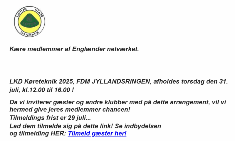 Fra vores Lotus venner har jeg modtaget: Kære medlemmer af Englænder netværket. LKD Køreteknik 2025, FDM JYLLANDSRINGEN, afhol